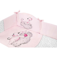 5-részes ágyneműgarnitúra Belisima LOVE babák számára. Tartalmaz: párnahuzatot, paplanhuzatot, rácsvédőt, párnát és paplan. Párnahuzatot 40x60 cm, takaró huzatot 90x120 cm és rácsvédőt 180 cm tartalmaz. Puha minőségi anyagból készült. Összetétel: 100% pamut. Ezek a termékek biztonságosak, mivel: a természetes pamut nem okoz bőrirritációt, mivel nem tartalmaz formaldehidet és egyéb, csecsemőkre káros anyagokat. Nem veszítenek színeik élénkségéből és nem színezi el a többi ruhát. Kellemes mintázatúak és színei nyugtató hatásúak. Az ágyneműhuzaton használt cipzár "biztonságos cipzár" lengővégek nélkül, amit a gyermek nem vehet le és nem nyelhet le! Nem tartalmaznak gombokat, sem műanyag illetve acél darabkákat, melyek veszélyesek lennének gyermeke számára. A párna és a paplan töltete antialergén anyagból készült ami azt jelenti, hogy nem terjeszt mikroorganizmusokat és penészt.