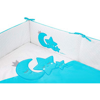 5-részes ágyneműgarnitúra Belisima Magic Stars babák számára. Tartalmaz: párnahuzatot, paplanhuzatot, rácsvédőt, párnát és paplan. Párnahuzatot 40x60 cm, takaró huzatot 90x120 cm és rácsvédőt 180 cm tartalmaz. Puha minőségi anyagból készült. Összetétel: 100% pamut. Ezek a termékek biztonságosak, mivel: a természetes pamut nem okoz bőrirritációt, mivel nem tartalmaz formaldehidet és egyéb, csecsemőkre káros anyagokat. Nem veszítenek színeik élénkségéből és nem színezi el a többi ruhát. Kellemes mintázatúak és színei nyugtató hatásúak. Az ágyneműhuzaton használt cipzár "biztonságos cipzár" lengővégek nélkül, amit a gyermek nem vehet le és nem nyelhet le! Nem tartalmaznak gombokat, sem műanyag illetve acél darabkákat, melyek veszélyesek lennének gyermeke számára. A párna és a paplan töltete antialergén anyagból készült ami azt jelenti, hogy nem terjeszt mikroorganizmusokat és penészt.