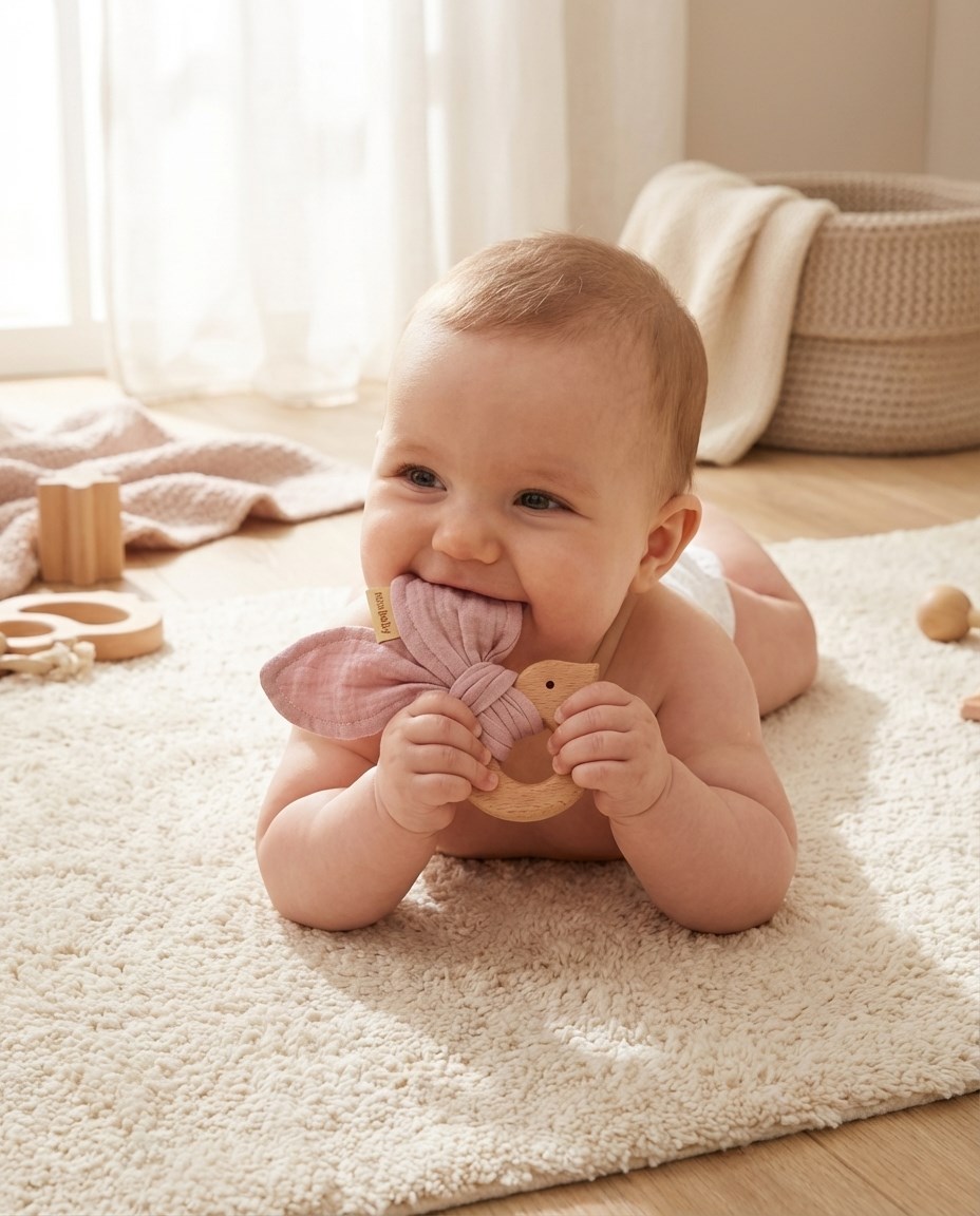 A muszlinpelenkás rágóka ideális készlet, ha a baba fogzik. A rágóka középpontbarát bükkfából és puha muszlinszövetből készült. Teljesen biztonságos a babák számára, nyugtató megkönnyebbülést hoz a fogzás alatt. A rágóka játékként is használható a babák számára. A rágóka tökéletesen illeszkedik a többi muszlin termékünkhöz, így egy gyönyörű készletet alkot, amelyet babaköszöntőre ajándékozhat.
