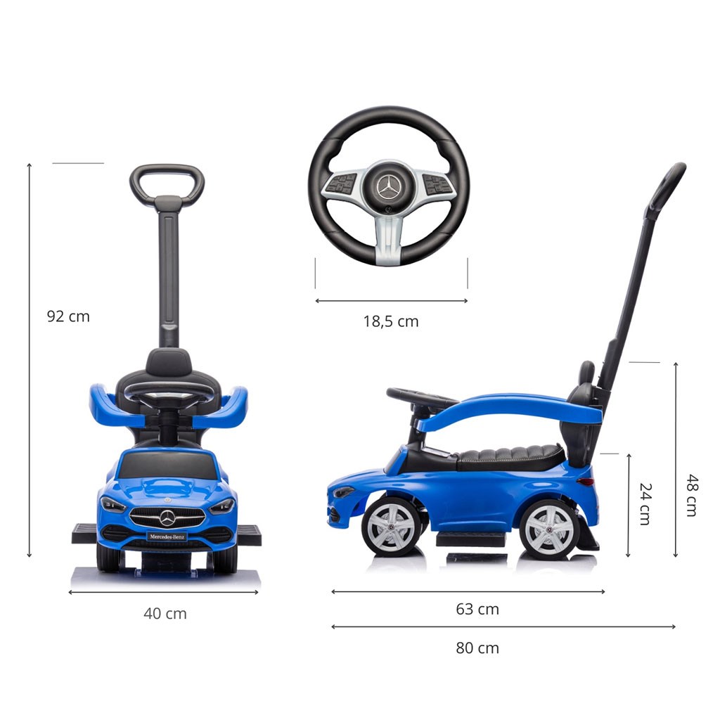 A Mercedes C-Class modell által inspirált élethű kialakítás olyan részletekkel vonzza a figyelmet, mint az elegáns kivitelezés, a gumiabroncsok, a márkalogó, a hangokkal ellátott kormány és a "műszerek", amelyek ösztönzik a gyermek képzeletét, és lehetővé teszik a kreatív játékot.
