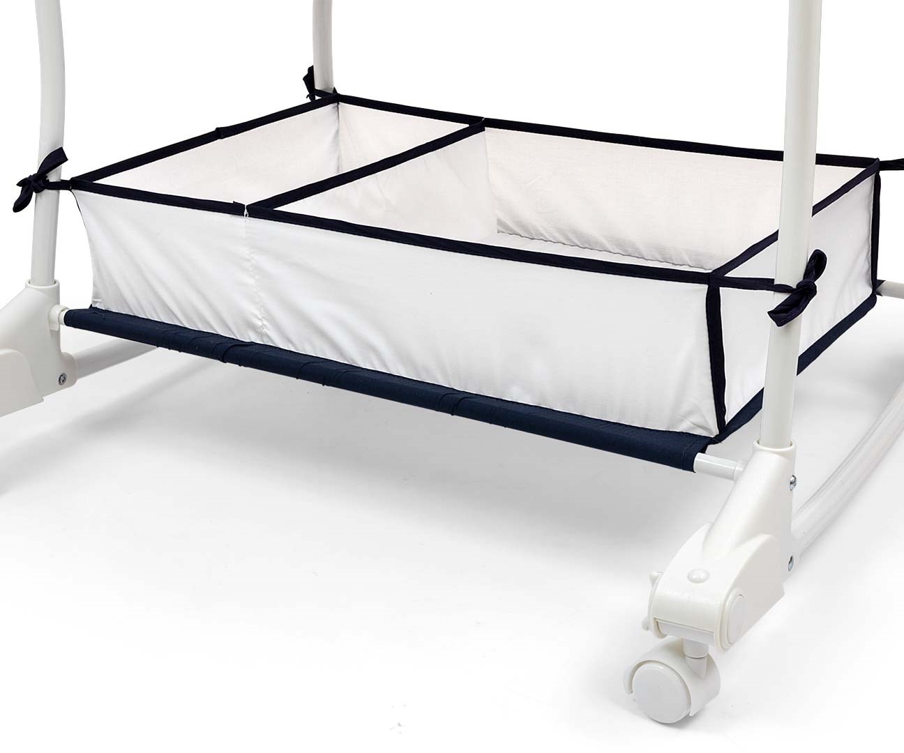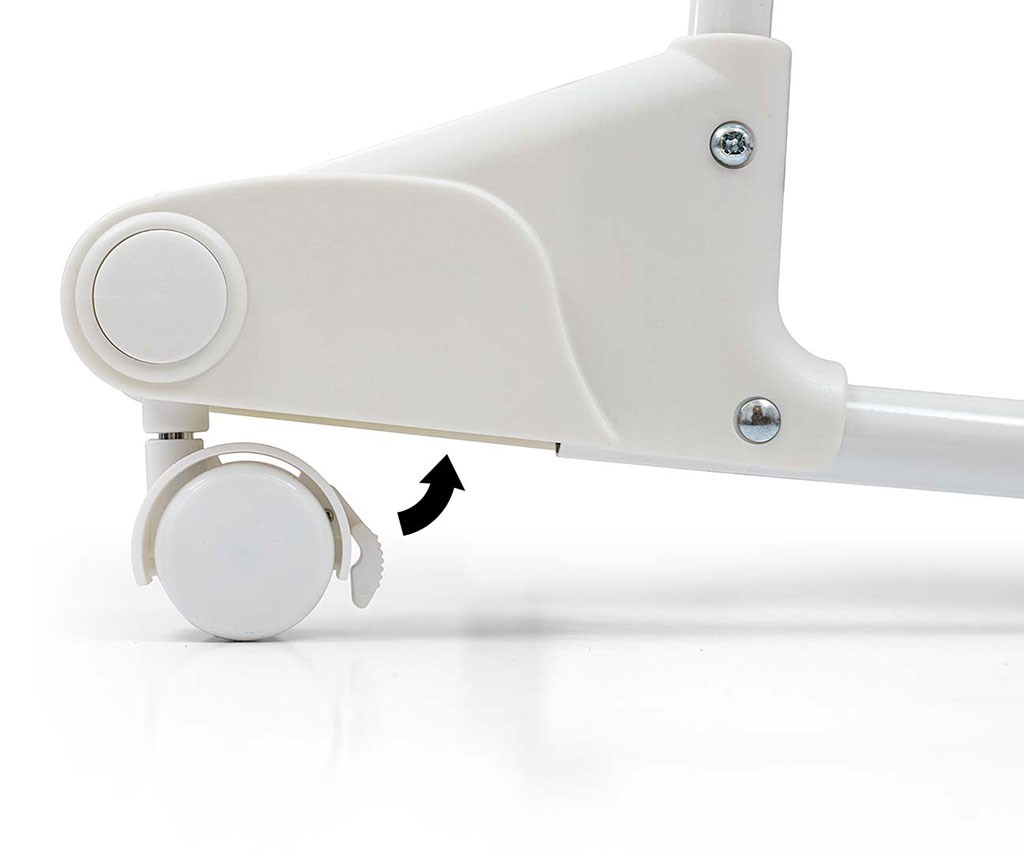 A funkcióváltáshoz a kiságyból bölcsővé történő átállításhoz húzzuk és fordítsuk el az egyes kerekeket, és azok visszahúzódnak a csúszdába.