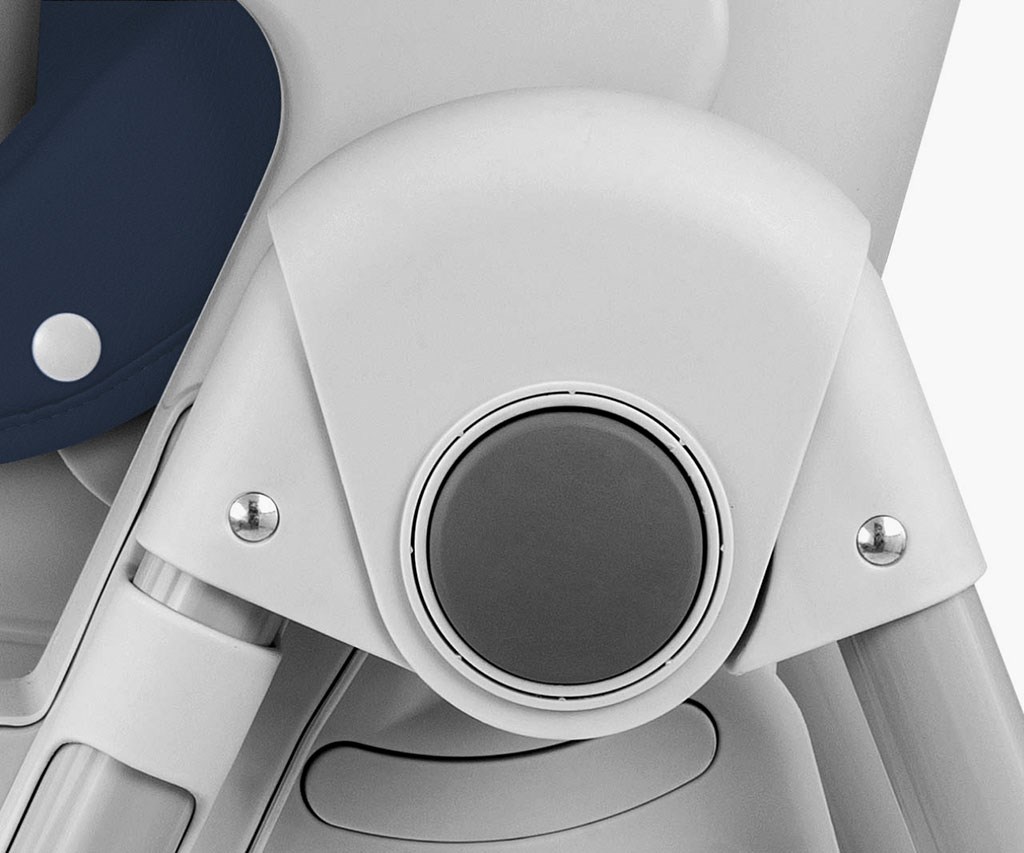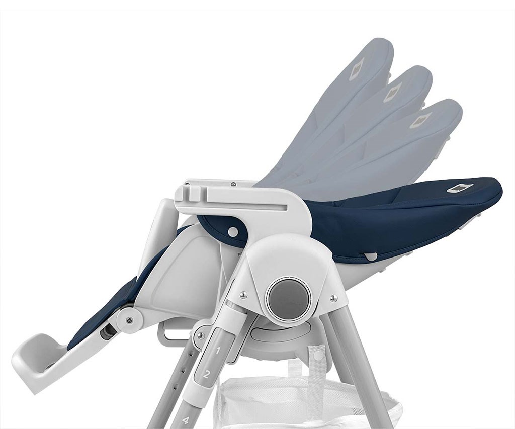 A szék kárpitja ökológiai bőrből készült, és puha betéttel is rendelkezik a legkisebbek számára. A gyermek biztonsága érdekében 5 pontos állítható övvel és további csúszásgátlóval van felszerelve. A háttámla hátulján van egy fogantyú a tálca felakasztására. A háttámla és a lábtámasz lehajtható. Az ülés 7 fokban emelhető vagy süllyeszthető, a lábak pedig beépített gumikerekekkel rendelkeznek. A teljes szerkezet könnyen és simán összecsukható.