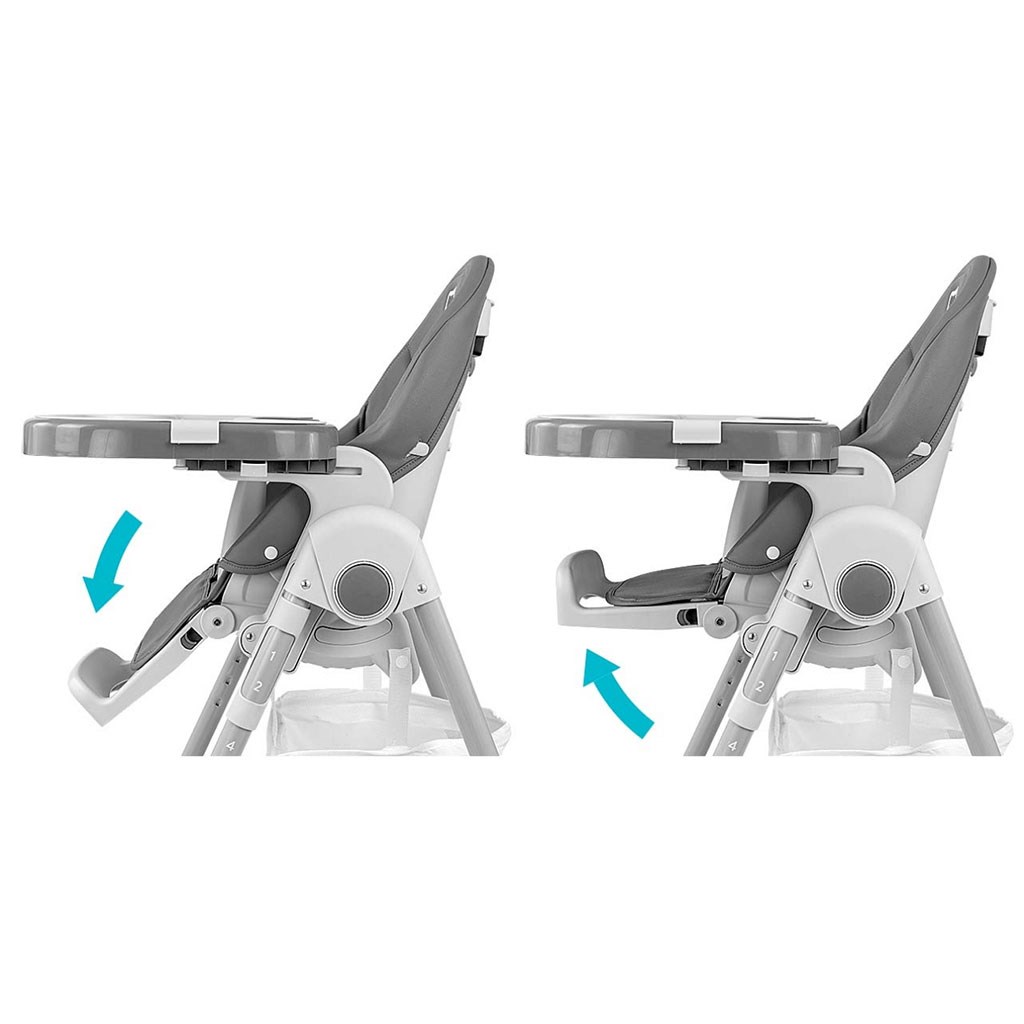 A szék kárpitja ökológiai bőrből készült, és puha betéttel is rendelkezik a legkisebbek számára. A gyermek biztonsága érdekében 5 pontos állítható övvel és további csúszásgátlóval van felszerelve. A háttámla hátulján van egy fogantyú a tálca felakasztására. A háttámla és a lábtámasz lehajtható. Az ülés 7 fokban emelhető vagy süllyeszthető, a lábak pedig beépített gumikerekekkel rendelkeznek. A teljes szerkezet könnyen és simán összecsukható.