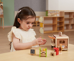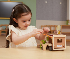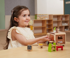 Fa kialakítású karavan barátságos színekkel, tökéletes eszköz a kreativitás és társas készségek fejlesztéséhez, szerepjátékhoz realisztikus élményt nyújtva.