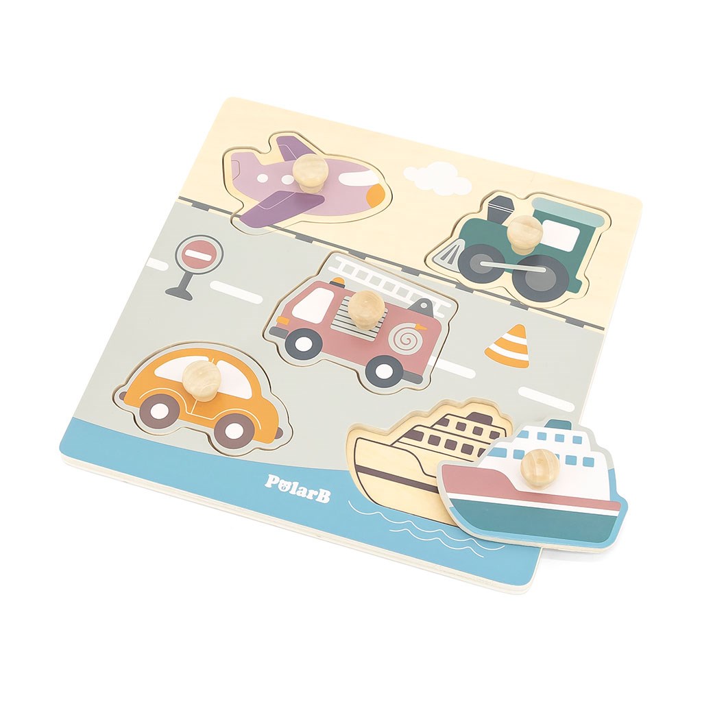 A kirakós darabjai fa csapokkal vannak ellátva, amelyek segítségével a kisgyermek könnyen a kezébe fogja a kirakót, és a megfelelő helyre helyezi a fa alapon.