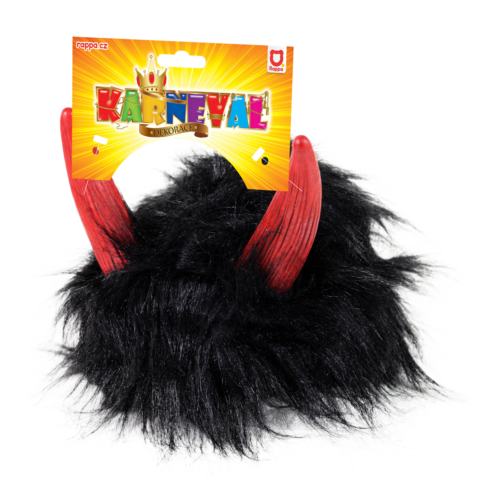 Farsangi paróka ördögi motívummal. A paróka fekete hajjal, rövid frufruval és ördögvörös tekercsekkel díszített.