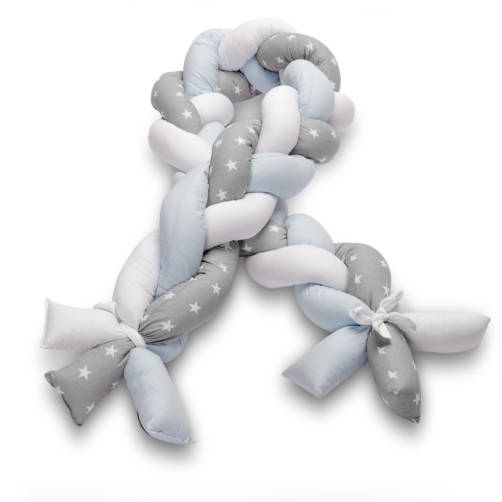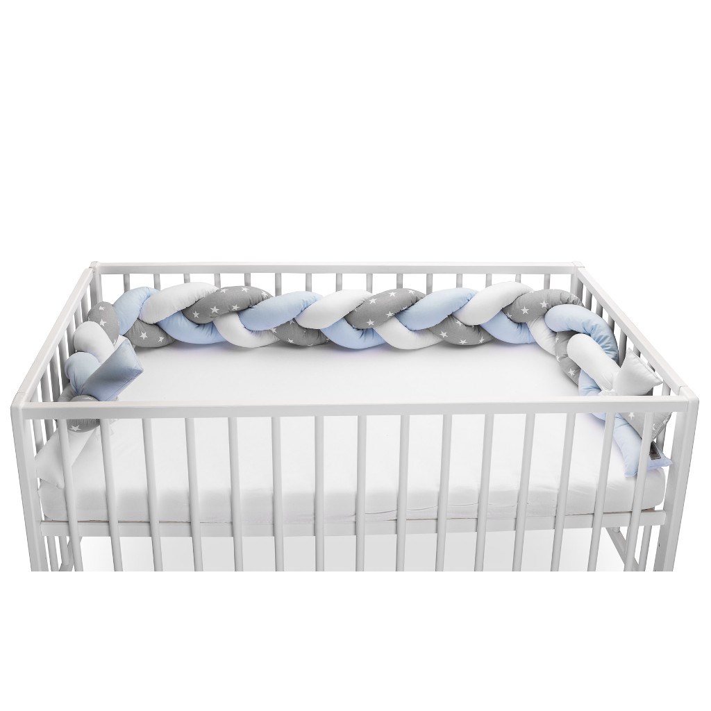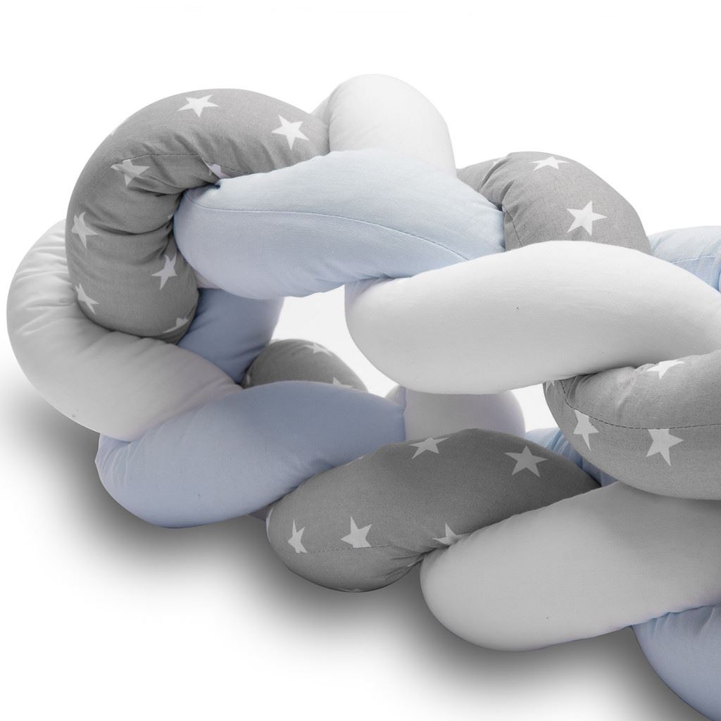 Fonott rácsvédő kiságyba Sensillo, puha és kellemes tapintású. Pamutból és antiallergén szilikon töltőanyagból készült. Minden végén szalag található, hogy a copfot a kiságyhoz lehessen rögzíteni. A rögzítéssel biztosítja gyermekének a biztonságos és egészséges alvást. A copf felhasználható babafészekként, vagy dekorációként a szobába, esetleg mint egy szigetelés a fal hidegétől.