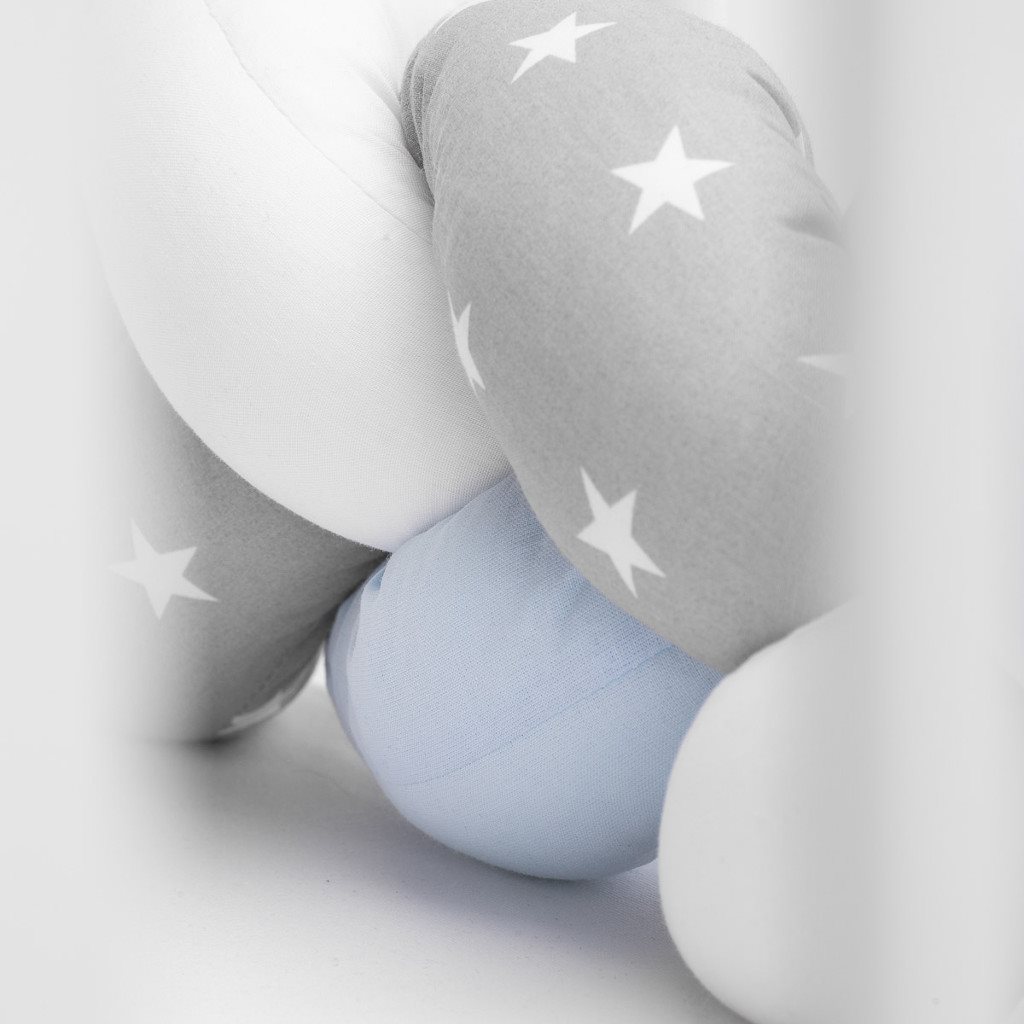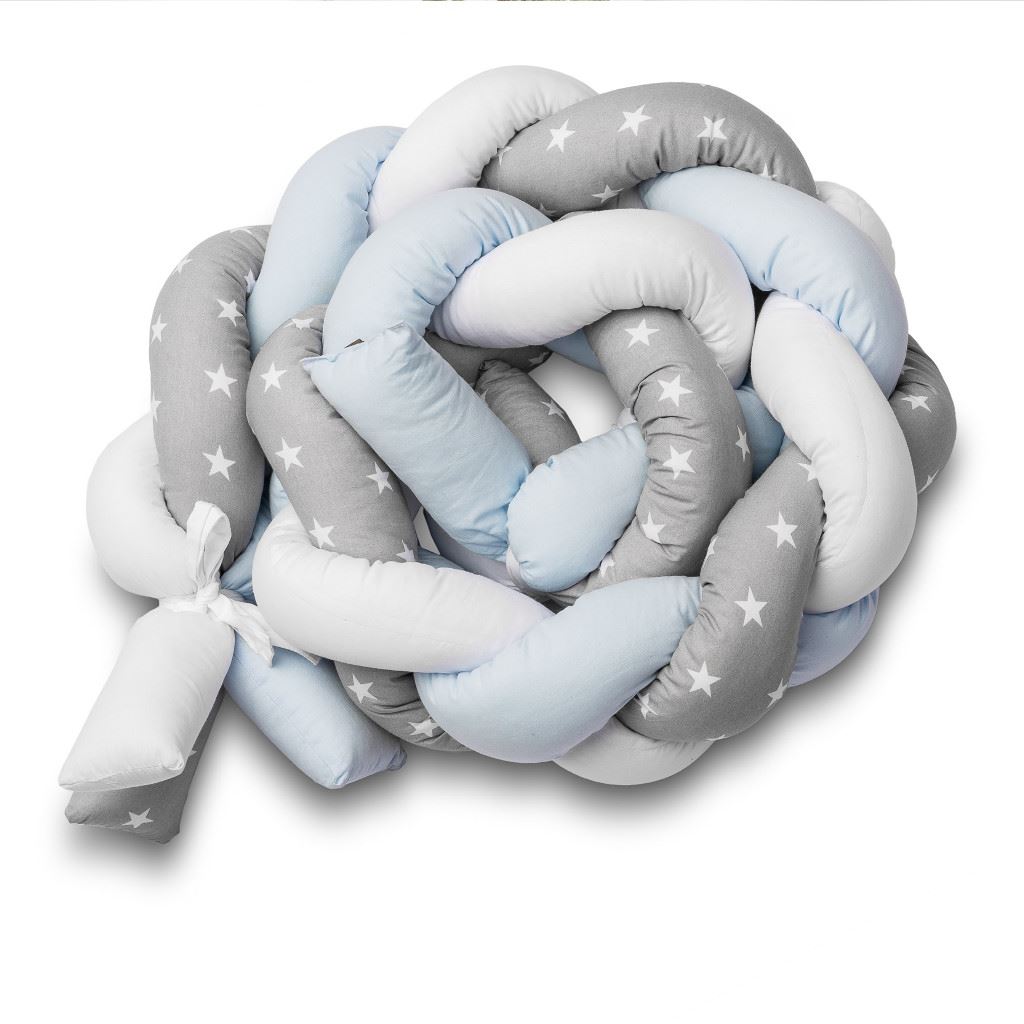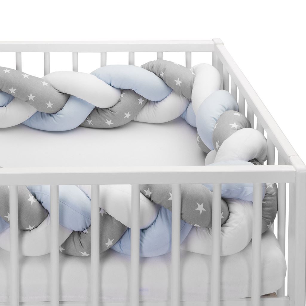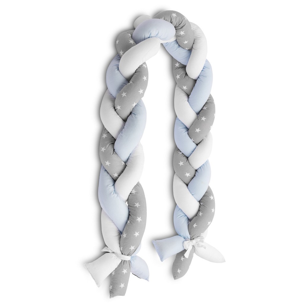 Fonott rácsvédő kiságyba Sensillo, puha és kellemes tapintású. Pamutból és antiallergén szilikon töltőanyagból készült. Minden végén szalag található, hogy a copfot a kiságyhoz lehessen rögzíteni. A rögzítéssel biztosítja gyermekének a biztonságos és egészséges alvást. A copf felhasználható babafészekként, vagy dekorációként a szobába, esetleg mint egy szigetelés a fal hidegétől.