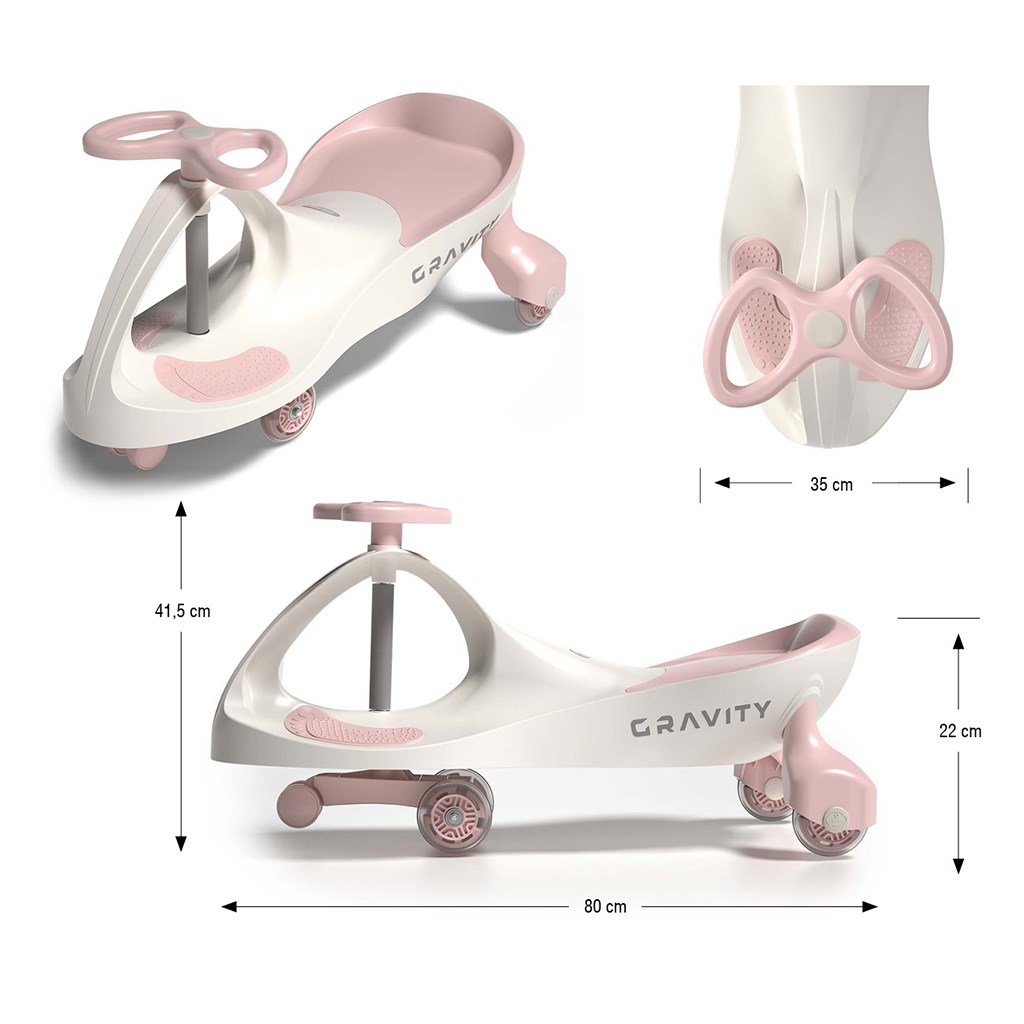 A GRAVITY gravitációs bébitaxi egy modern gyermek jármű, amely elemek és pedálok nélkül működik – elég a kormányt jobbra-balra mozgatni, és a jármű elindul. Ideális választás 3 éves kortól azoknak a gyerekeknek, akik szeretnek mozogni és önállóan közlekedni.