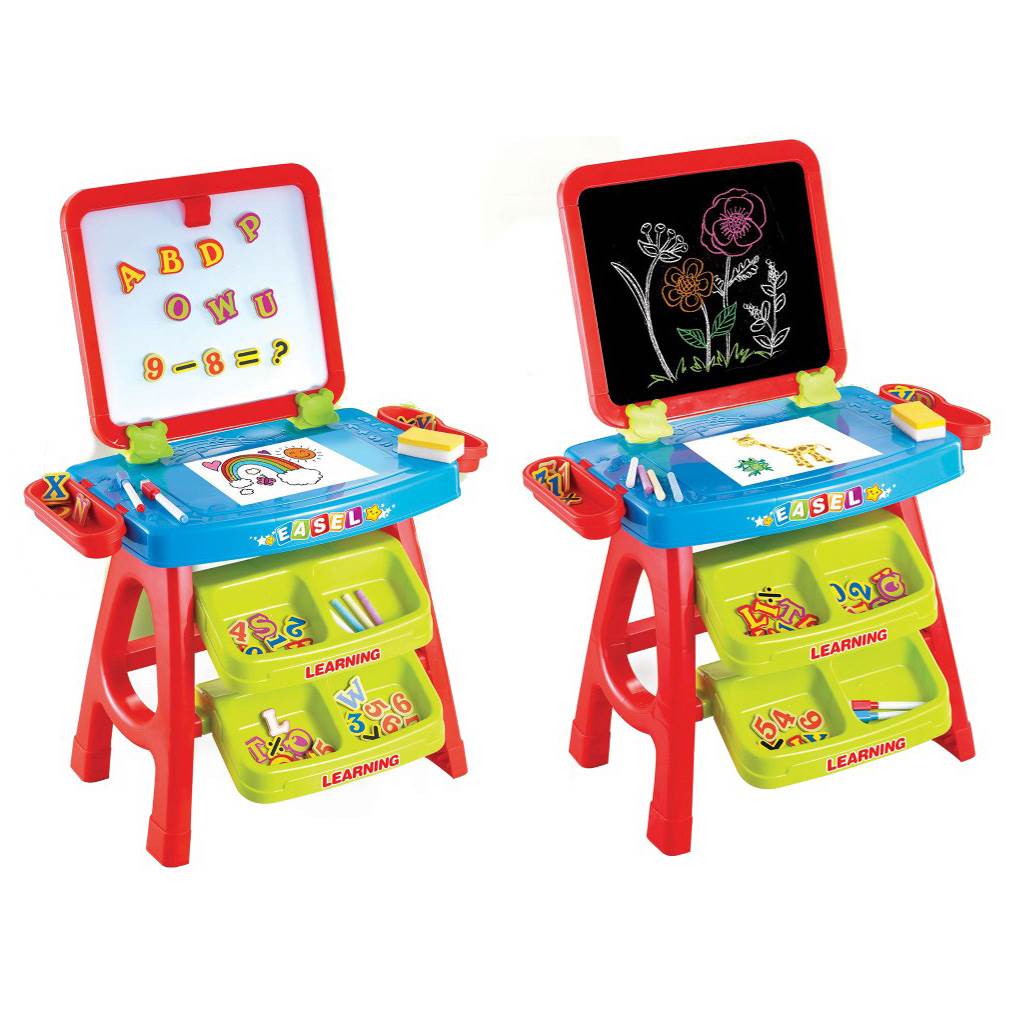 Nagyszerű oktató mágnes tábla 3az1-ben Baby Mix. A tábla segítségével játszva tanulhatnak a gyerekek, legyen szó akár betűkről, akár számokról! Az egyik oldala fehér mágneses a betűk és számok kirakására, vagy rajzolásra a hozzáadott toll segítségével. A másik oldala klasszikus fekete tábla, ezen az oldalon krétával lehet rajzolni. Az egész készlet 42 mágneses betűt és számot, két tollat, egy szivacsot és négy krétát tartalmaz. Az oktató tábla asztalkát, két kisebb és két nagyobb tárolóhelyet tartalmaz