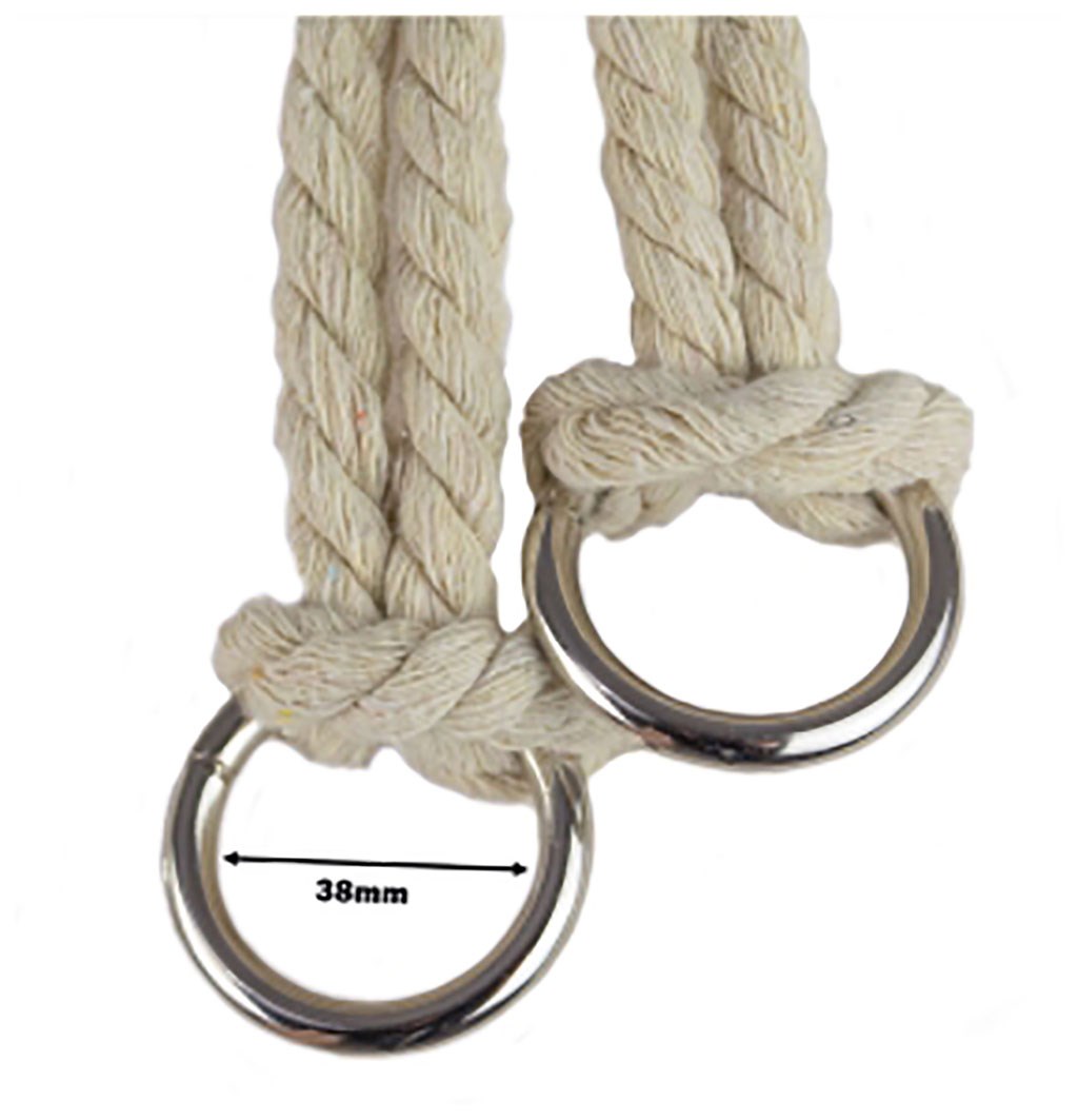A vastag pamutkötelek fém függőkerekekkel vannak felszerelve, és dekoratív bojtokkal vannak ellátva.