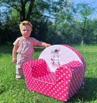 Gyermek fotel New Baby Zebra. A gyerekszobába alkalmas. Puha minőségi anyagból készült. Pamut bevonattal rendelkezik amely levehető és mosható. Szép színekbe, pöttyös és zebra képpel díszitve. Mérete 42x53 cm, háttámla magassága kb 29 cm, szélessége kb 25 cm. Anyaga: bevonat 100% pamut, belső anyaga poliuretán hab.