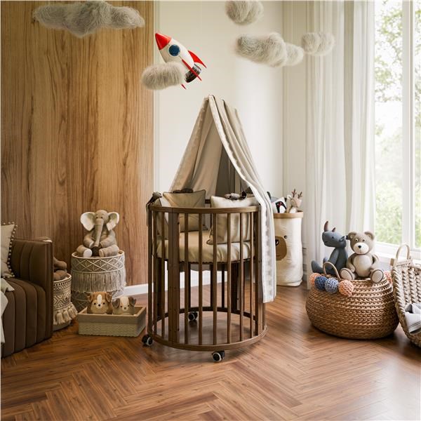 Ez a 3 az 1-ben kiságy ötvözi a funkcionalitást, esztétikát és biztonságot. Lekerekített formája bármilyen belső térbe illik, a masszív fa szerkezet pedig tartósságot biztosít.