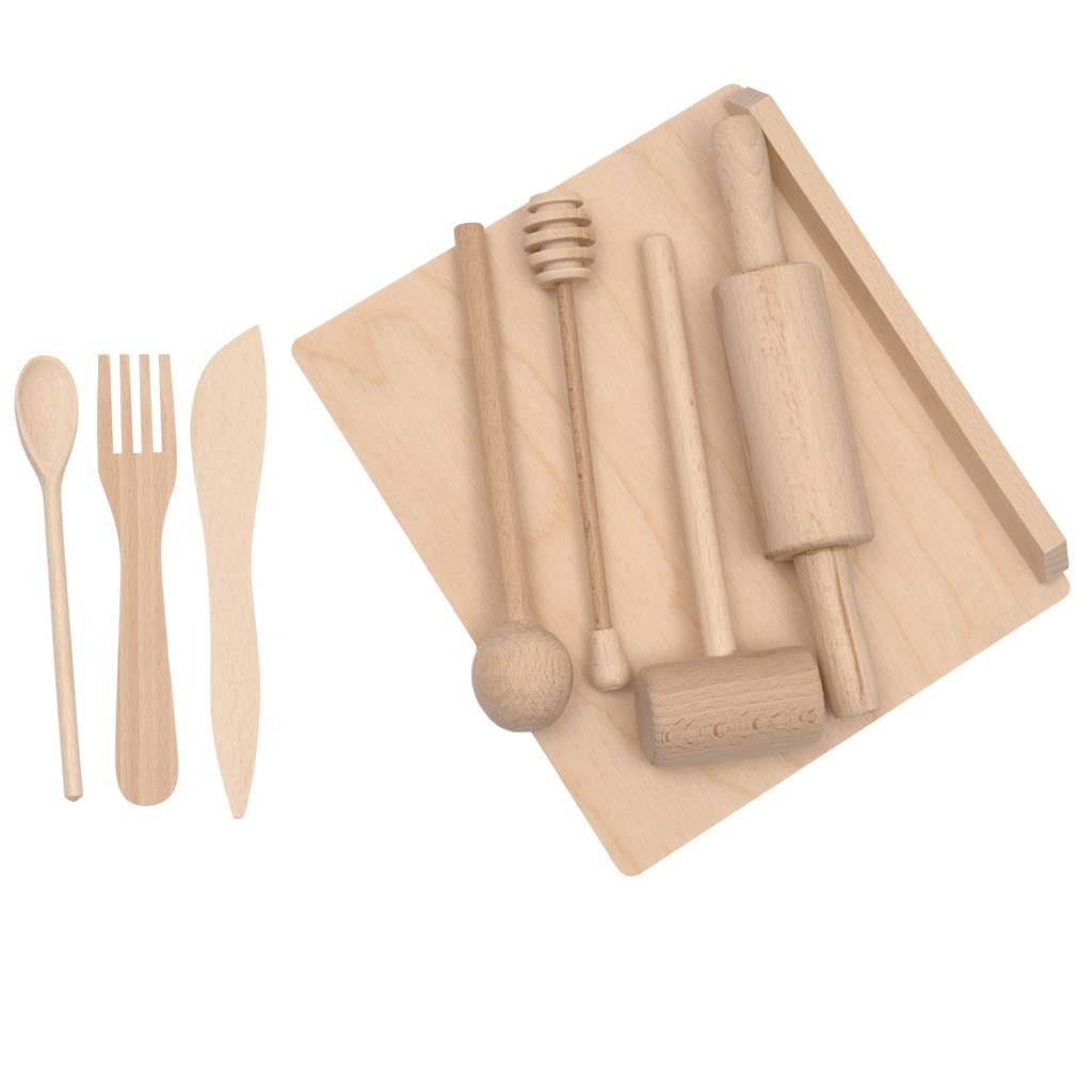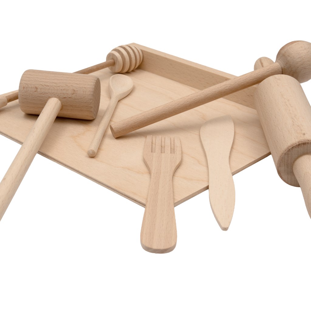 A gyerekek imádni fogják a játékfőzést – nyújthatnak vele tésztát, gyurmát, keverhetnek mézet vagy készíthetnek vajas finomságokat. A szett minden darabja segíti a kreatív játékot, fejleszti a finommotorikát és örömet szerez a kis szakácsoknak.