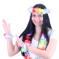 A kihagyhatatlan karneváli díszlet a "Hawaii" stílusában nagyszerű kiegészítője a jelmeznek. Ez a színes szett 2 karkötőt, 1 nyakláncot és 1 fejpántot tartalmaz. Mindent virágszirmok és egy gyönyörű csokor díszít. Egy szenzáció!
