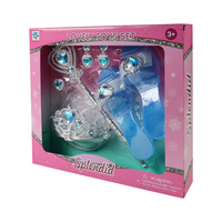 Válj igazi hercegnővé! Ez a gyönyörű készlet mindent tartalmaz, amire egy kis hercegnőnek szüksége van a mesebeli kalandokhoz. Elegáns copfok, korona, fülbevaló, gyűrű és varázspálca. Az ezüst és kék színkombinációnak köszönhetően az egész készlet nagyon ünnepélyesen és varázslatosan néz ki. Nemcsak otthoni játékra, hanem farsangi, születésnapi vagy gyerekzsúrra is alkalmas.