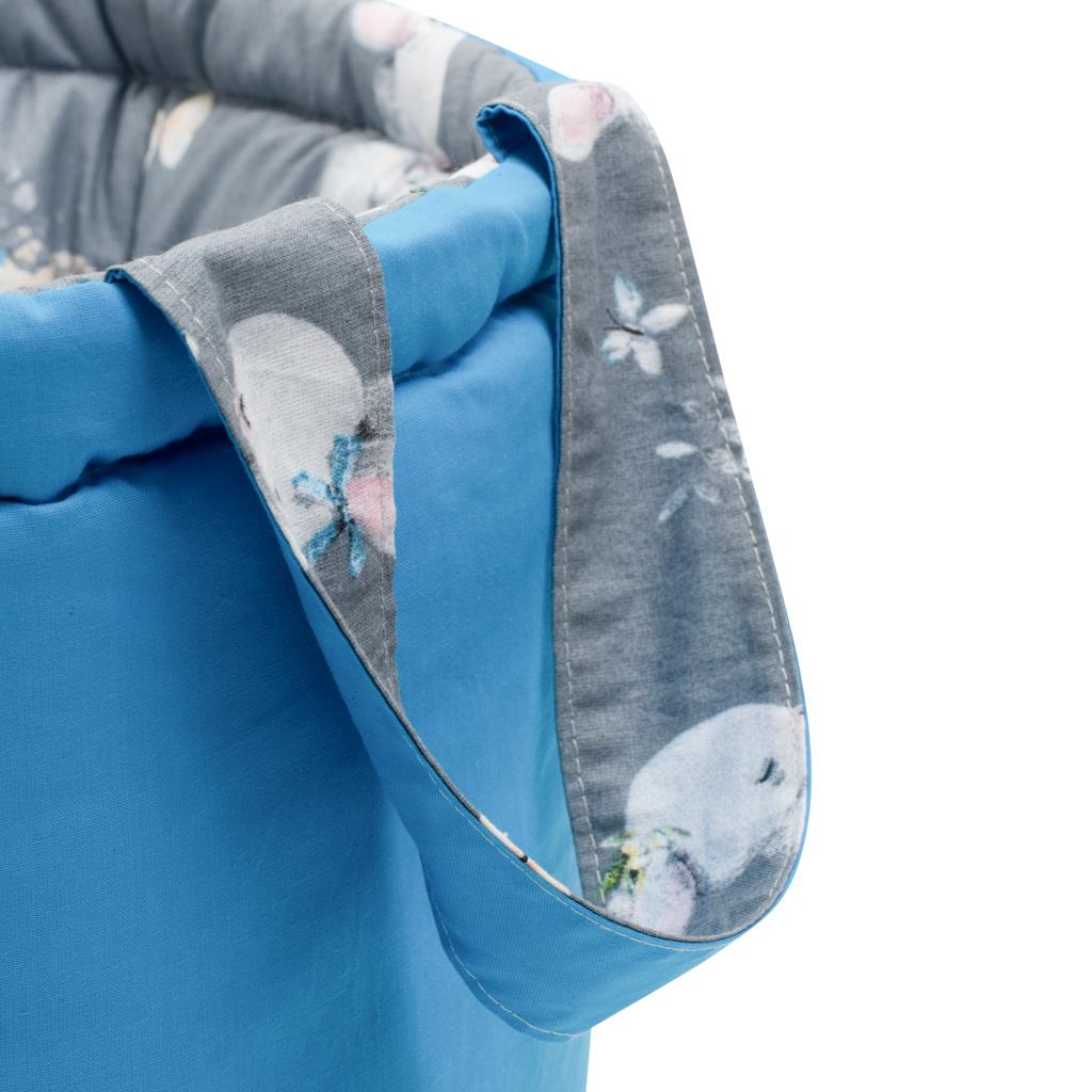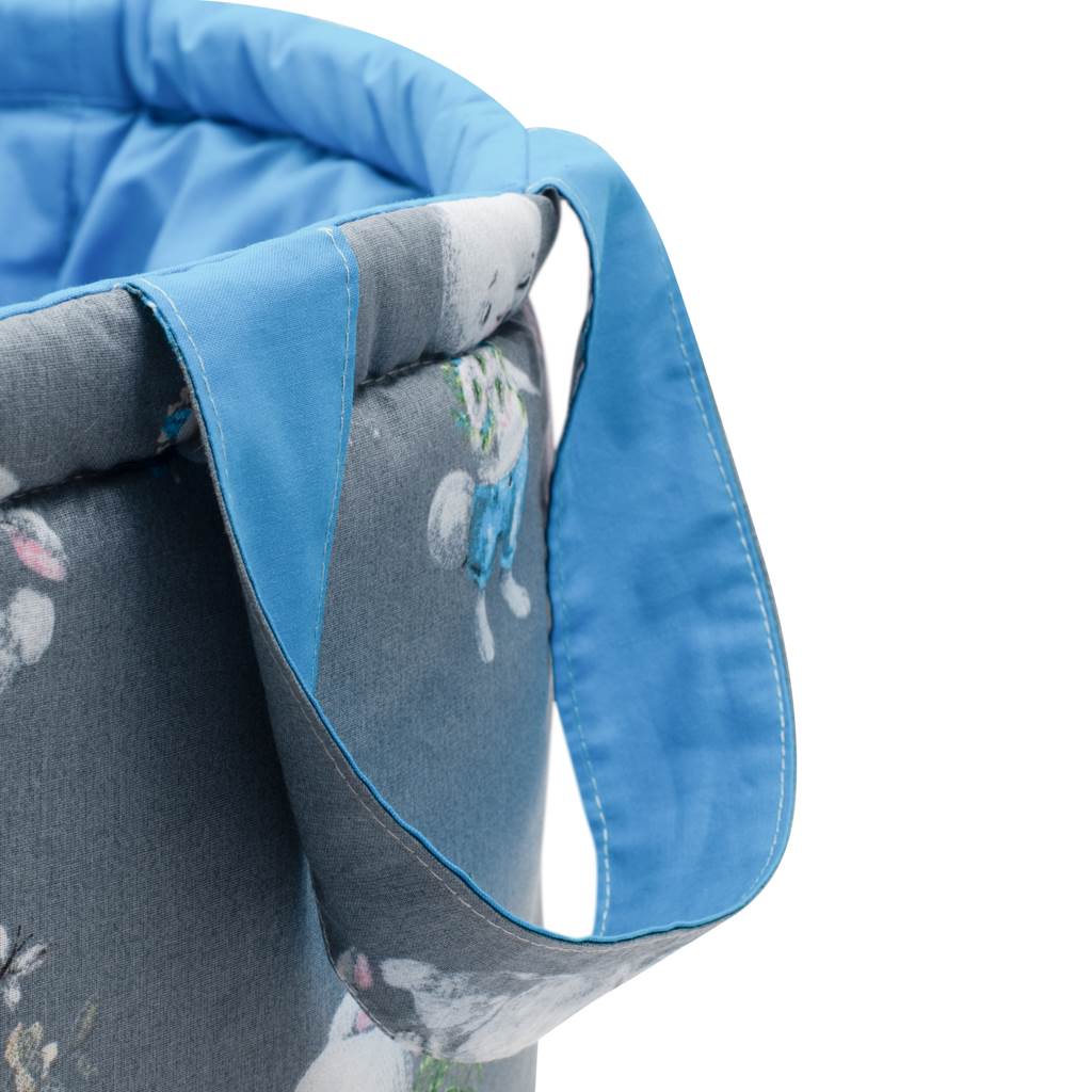 A New Baby nyuszis pamut kosár egy rendkívül praktikus kiegészítő a gyerekszoba gyors takarításához és játékok szállításához. Ruhakosárként is használható. Kétoldalas, 100% pamutból készült. Poliészter szál réteggel volt megerősítve, annak köszönhetően megőrzi alakját, összerakva pedig a fiókban is elfér.