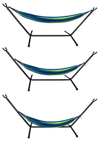Acélállvány – A függőágy porfestett acélkerettel rendelkezik, amely rendkívül ellenálló az időjárási hatásokkal szemben. Stabil alapja és megerősített szerkezete kényelmet és biztonságot nyújt. Maximális teherbírás: 200 kg. Az állványon 4 lyuk található a kampók magasságának állítására.