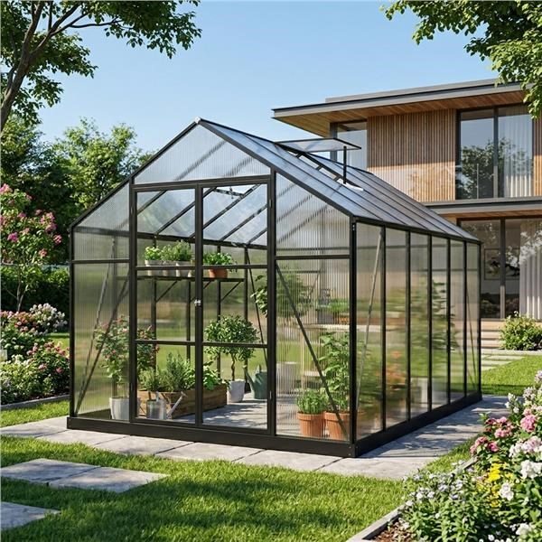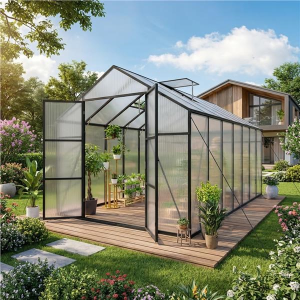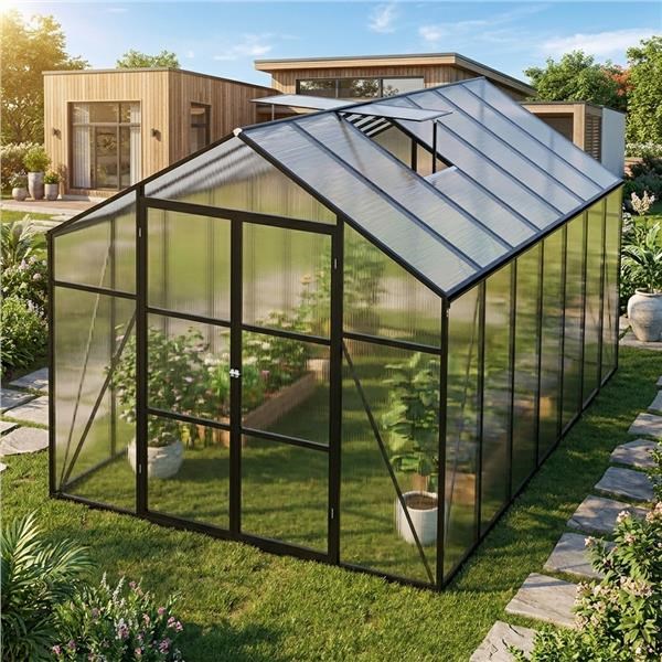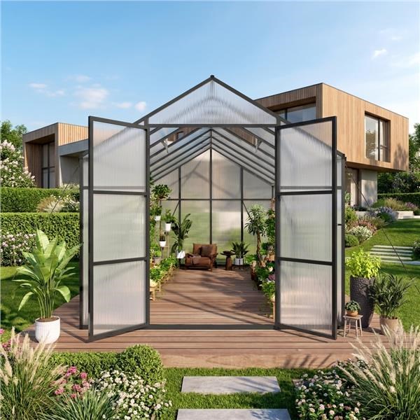Hozzon létre saját termesztőterületet a kertjében, és biztosítson a növényeknek egész évben stabil körülményeket. Ez a tágas üvegház a szilárd alumínium váz és a kiváló minőségű polikarbonát panelek kombinációját kínálja, amelyek optimális fényáteresztést, UV-védelmet és kiváló hőszigetelést biztosítanak.