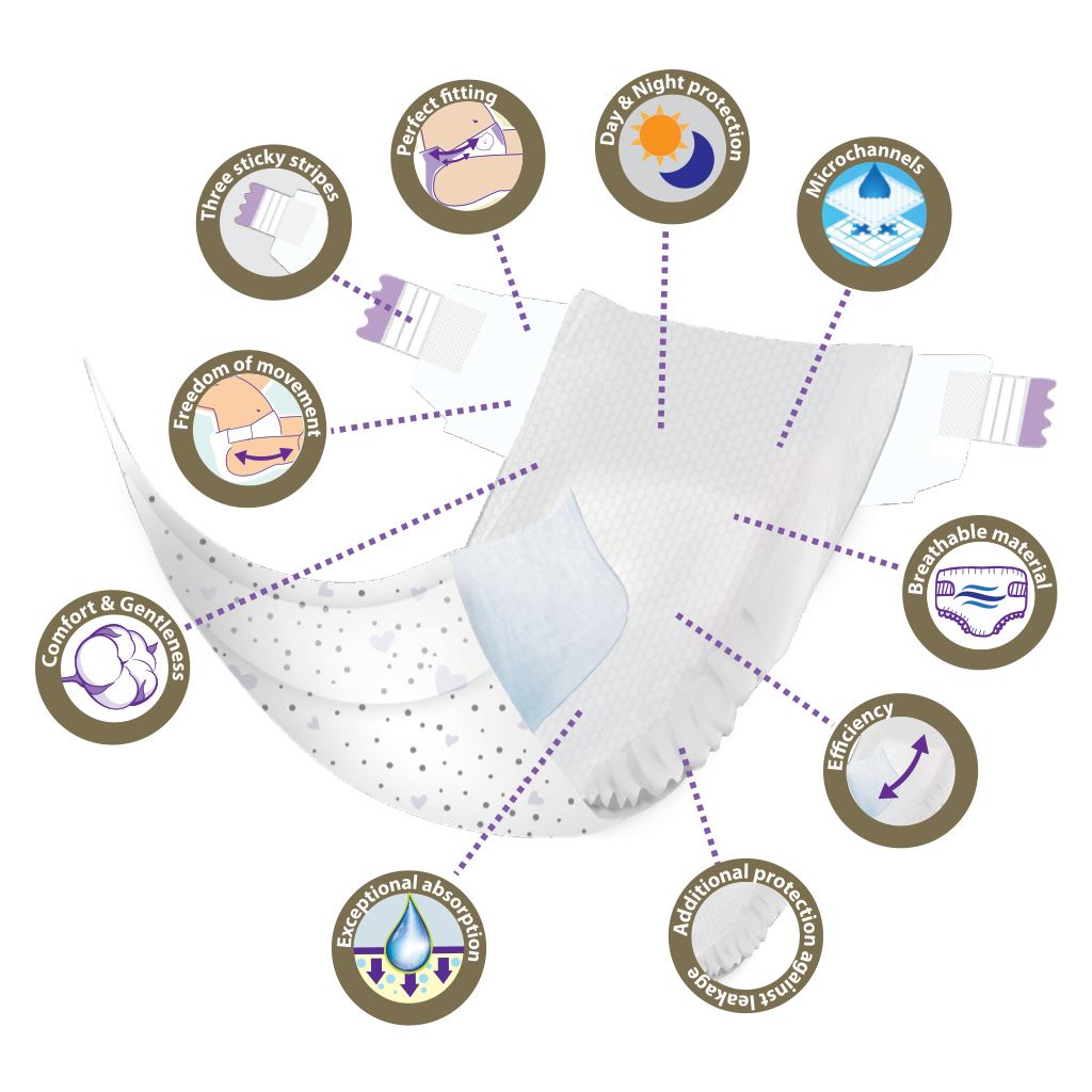 Selymes, puha baba eldobható pelenka New Love Premium comfort kifejezetten úgy fejlesztették ki, hogy a csecsemő bőre már az első érintés óta érezze a szeretetet. A speciálisan megtervezett nedvességfelszívó csatornák biztosítják az egyenletes folyadék elosztást a pelenkába, magába tartja a szuper abszorbens magot és meggátolja, hogy rögök képződjenek a magába szívott folyadékból. Biztosítják az abszorbens mag hosszabb élettartamát és védelmet nyújt a baba gyengéd bőrének. Az innovatív szuper abszorbens mag azonnal elvezeti a nedvességet a baba bőrétől és szárazon tartja a kisbaba bőrét akár 12-órán át. Annak érdekében, hogy a bőr szabadon lélegezzen, a pelenkák légáteresztő anyagokból készülnek.