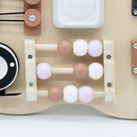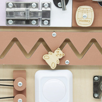 A medve alakú Busy Board fa játéktábla hosszú órákon át lefoglalja a gyerekeket, miközben támogatja természetes fejlődésüket. A különböző elemek kombinációjának köszönhetően a gyermek szórakoztató és biztonságos formában fejleszti finommotorikáját, türelmét és logikai gondolkodását.