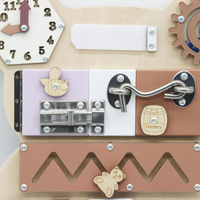 A manipulációs tábla ideális otthoni játékhoz, utazáshoz és a nyugodt pillanatokhoz. Segít a gyermekeknek az önállóság elsajátításában, például a bezárás, a kinyitás vagy a mozgások koordinációja terén.