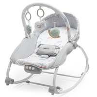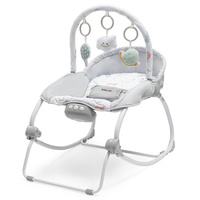 Zenélő, világító, rezgő hintáztatható pihenőszék. Levehető kar, 3 játékkal felszerelve. A pihenőszék két féle pozícióba és rögzítet helyzetbe állítható, amely mind etetőszék használható. A borítás összetétele: 100% pamut. Teherbírás: 9 kg (hinta), 18 kg (ülőke). 3 1,5V AAA elemekre működik. A csomagolás nem tartalmazza az elemeket.