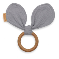 Biztonságos rágóka természetes bükkfából, puha muszlin anyaggal kombinálva. Ideális a fogzás időszakában – megnyugtat és első játékként is szolgálhat.