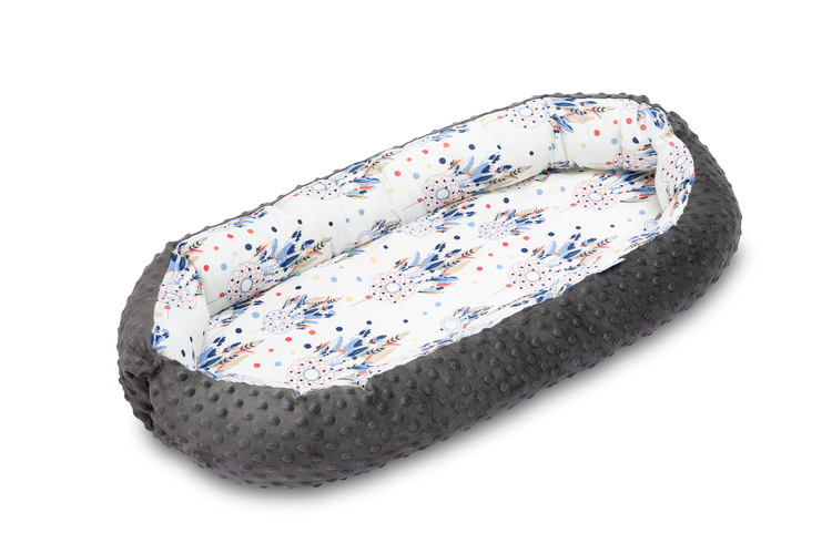 A Cocoon a születéstől körülbelül 6 hónapos korig alkalmas csecsemők számára. Kényelmes rögzítéssel rendelkezik, 2 rögzítőelemmel. Az alapja egy kivehető matrac, amely poliuretán habból készült. A külső anyag finom 100% pamut, puha mintás anyaggal kombinálva. A henger töltete antiallergén szilikongyöngyök. A szállítást és tárolást megkönnyíti a termékhez mellékelt tartós huzat.