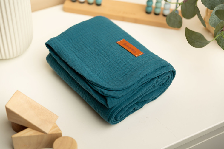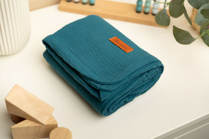 A muszlin takaró kiváló minőségű, 100% pamutszövetből készült. Két réteg pamutból készült, így könnyű és légies. Hasznosnak bizonyul a meleg, napos napokon tett séták során, és használható vastagabb takaróként, mindennapi játékhoz vagy takaróként etetés közben. A puha pamut megfelelő légáramlást biztosít, és nem érzékenyíti és nem irritálja a baba bőrét. A takaró további előnye az anyag gyönyörű textúrája.
