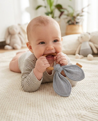 A muszlinpelenkás rágóka ideális készlet, ha a baba fogzik. A rágóka középpontbarát bükkfából és puha muszlinszövetből készült. Teljesen biztonságos a babák számára, nyugtató megkönnyebbülést hoz a fogzás alatt. A rágóka játékként is használható a babák számára. A rágóka tökéletesen illeszkedik a többi muszlin termékünkhöz, így egy gyönyörű készletet alkot, amelyet babaköszöntőre ajándékozhat.